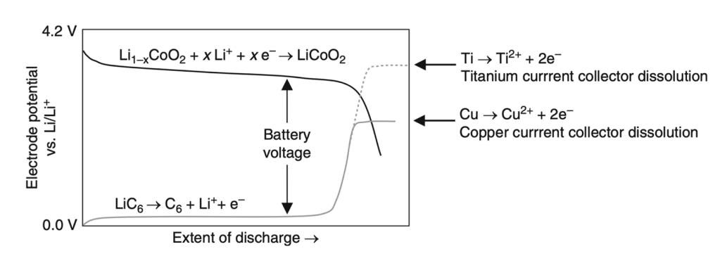 With this equation, it is then evident that the potential of the positive electrode must be maximized while that of the negative electrode must be minimized in order to obtain the largest battery potential. This can be observed clearer in Figure 28, where the upper curve represents the reactions occurring at the positive electrode, and the lower curve, the reactions occurring at the negative electrode: