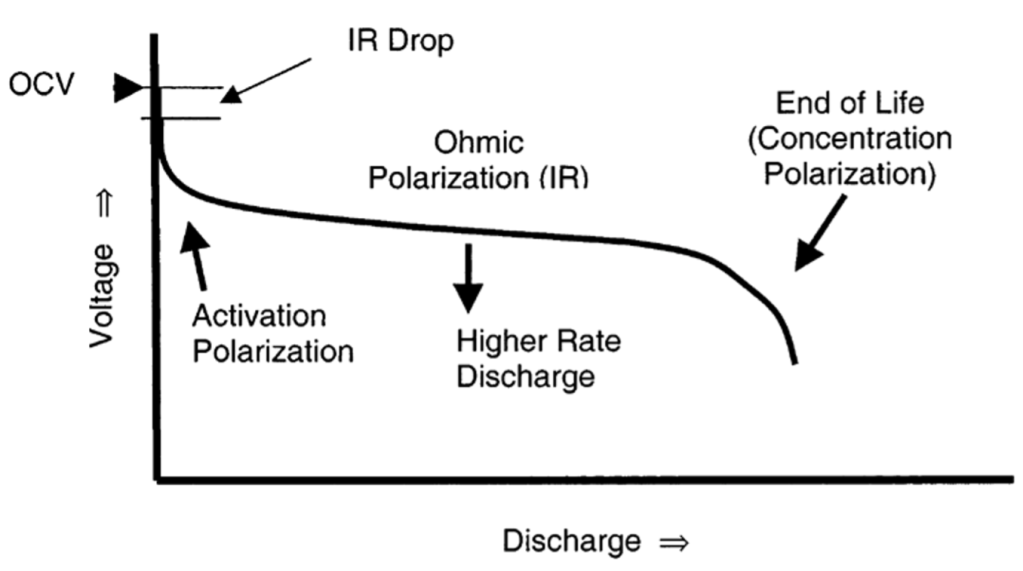 There are several types of polarization that can affect battery performance, which can be observed in the following graph:
