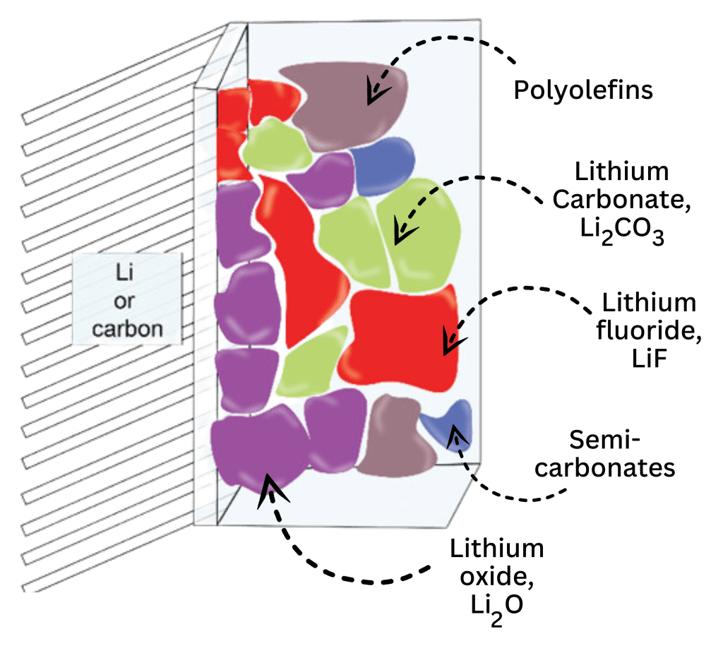 When a freshly created battery is cycled for the first time, a series of spontaneous reactions take place. Given that the anode is set to operate at very low potentials, a decomposition occurs between the electrode and the electrolyte. This can be better envisioned with the following diagram: