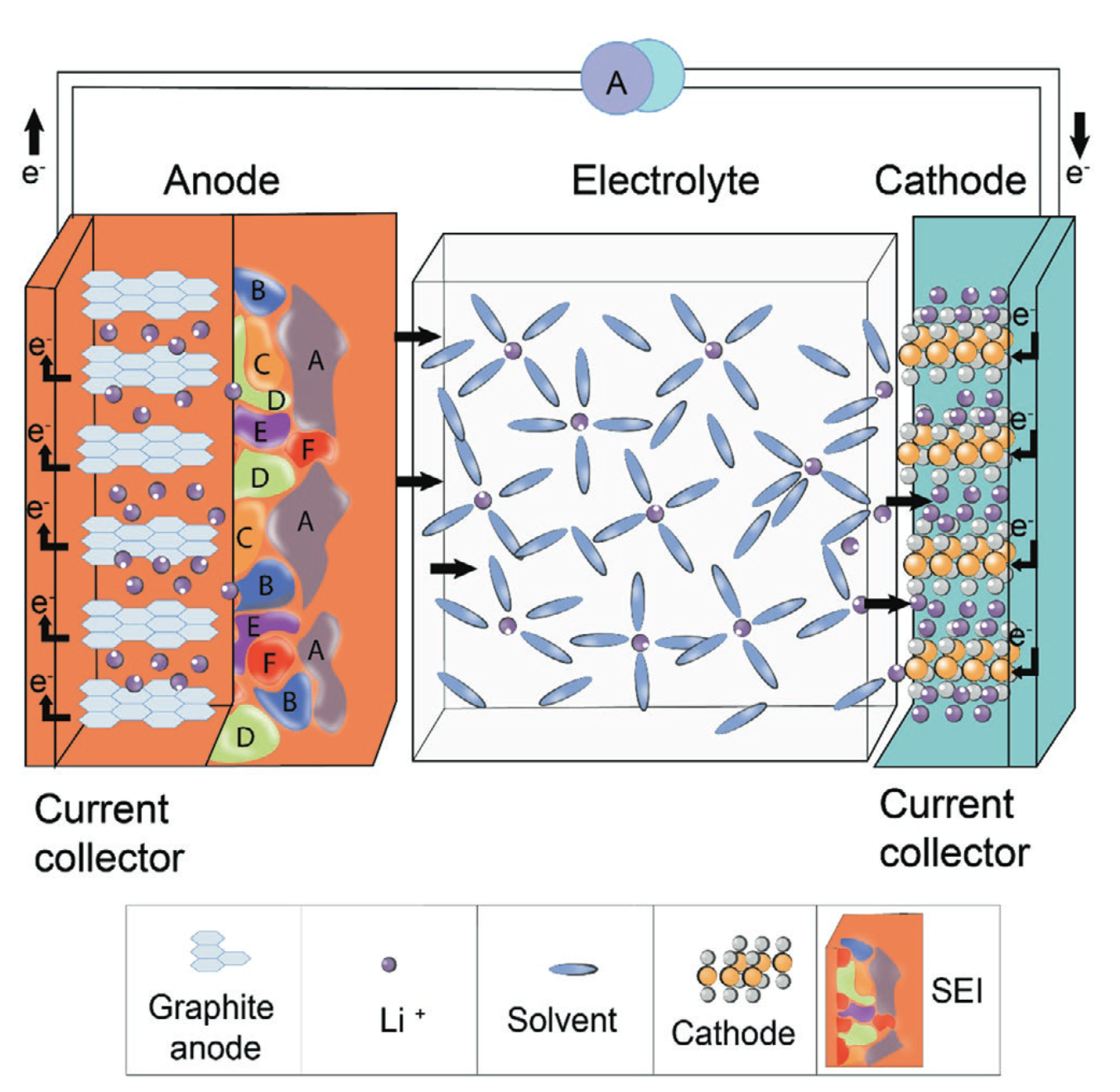 These reduction reactions result in the decomposition of electrolyte components, leading to the formation of a complex, mostly ionically conductive layer on the anode’s surface—this is the SEI layer. The SEI layer is critical for battery performance for several reasons. Firstly, it acts as a physical barrier that prevents further direct contact between the anode and the electrolyte, thereby substantially reducing further decomposition of the electrolyte. This prolongs the electrolyte’s life and, by extension, the overall battery’s life. Secondly, while it prevents electrons from directly interacting with the electrolyte, it allows lithium ions to pass through. This selectivity ensures that lithium-ion intercalation and de-intercalation can continue to occur at the anode, which is essential for the battery to charge and discharge.