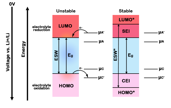 muA and muC represent the redox potentials of the anode and the cathode, respectively while phiA and phiC represent the work functions of each electrode. ESW represents the electrochemical window of stability of the electrolyte, which refers to the voltage range within which the electrolyte remains chemically stable and does not undergo decomposition. However, when the voltage drops below this window at the anode’s surface, the electrolyte components undergo reduction reactions because their redox potential is higher than the potential of the anode at this moment. As can be observed in the diagram, when the lowest unoccupied molecular orbital (LUMO) of the electrolyte is lower than the redox potential of the anode, the electrolyte will be reduced. Likewise, if the highest unoccupied molecular orbital (HOMO) of the electrolyte is higher than the redox potential of the cathode, the electrolyte will be oxidized.