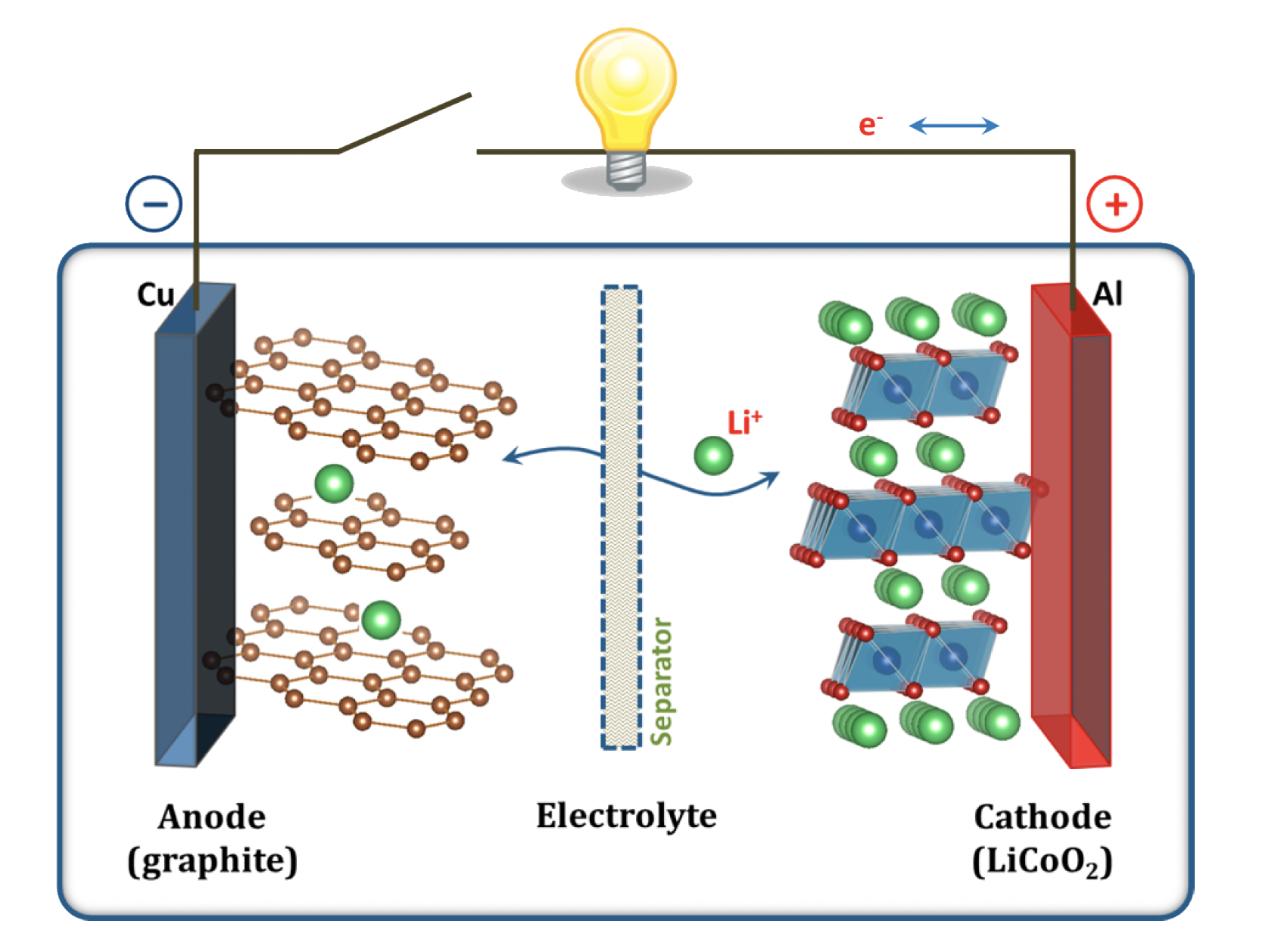When all the positive ions have relinquished the negative electrode and are now intercalated in the positive one, the battery is considered to be discharged, and must now undergo a charging process to be able to perform work again. For this to happen, an external, electric current is run through the battery, which detaches the positive ions from the positive electrode and moves them back into the negative one. It then becomes evident that this process is non-spontaneous, for it does not transpire naturally but rather, requires external energy to take place. The following diagram demonstrates this process in action, with the lithium ions moving inside each electrode during the cycling of the battery.