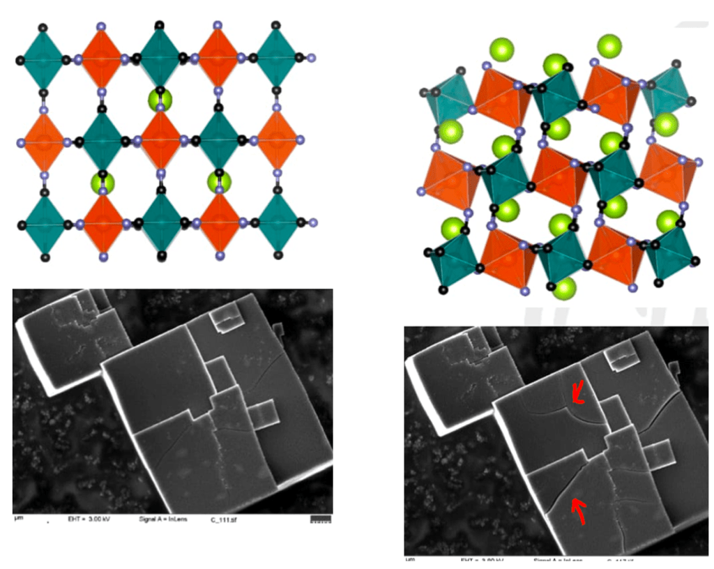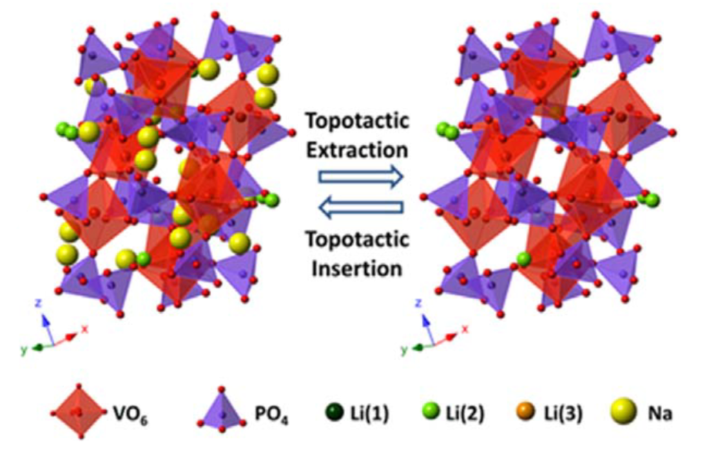 The following diagrams show a non-topotactic electrode cracking after sodium-ions have been inserted (right).