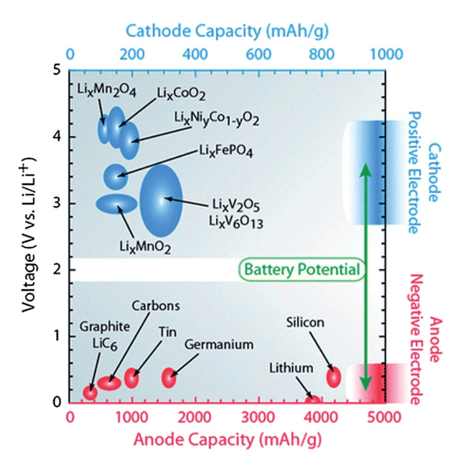 High Reaction Potential: The reaction potential refers to the voltage difference an electrode can achieve relative to the lithium/lithium-ion reference electrode during charge and discharge. For the positive electrode (cathode), a high reaction potential is especially desirable, since it directly increases the overall cell voltage and thus the energy density of the battery (energy density ≈ capacity × voltage). As shown in the figure, cathode materials such as layered oxides (LiCoO₂, LiNiₓCo₁₋ᵧO₂) and polyanionic compounds (LiFePO₄) operate at higher voltages, while anode materials like graphite or silicon lie closer to 0 V. The specific reaction potential of each material is dictated by its intrinsic redox couple and local electronic structure, which govern how easily lithium ions and electrons can be inserted or extracted.