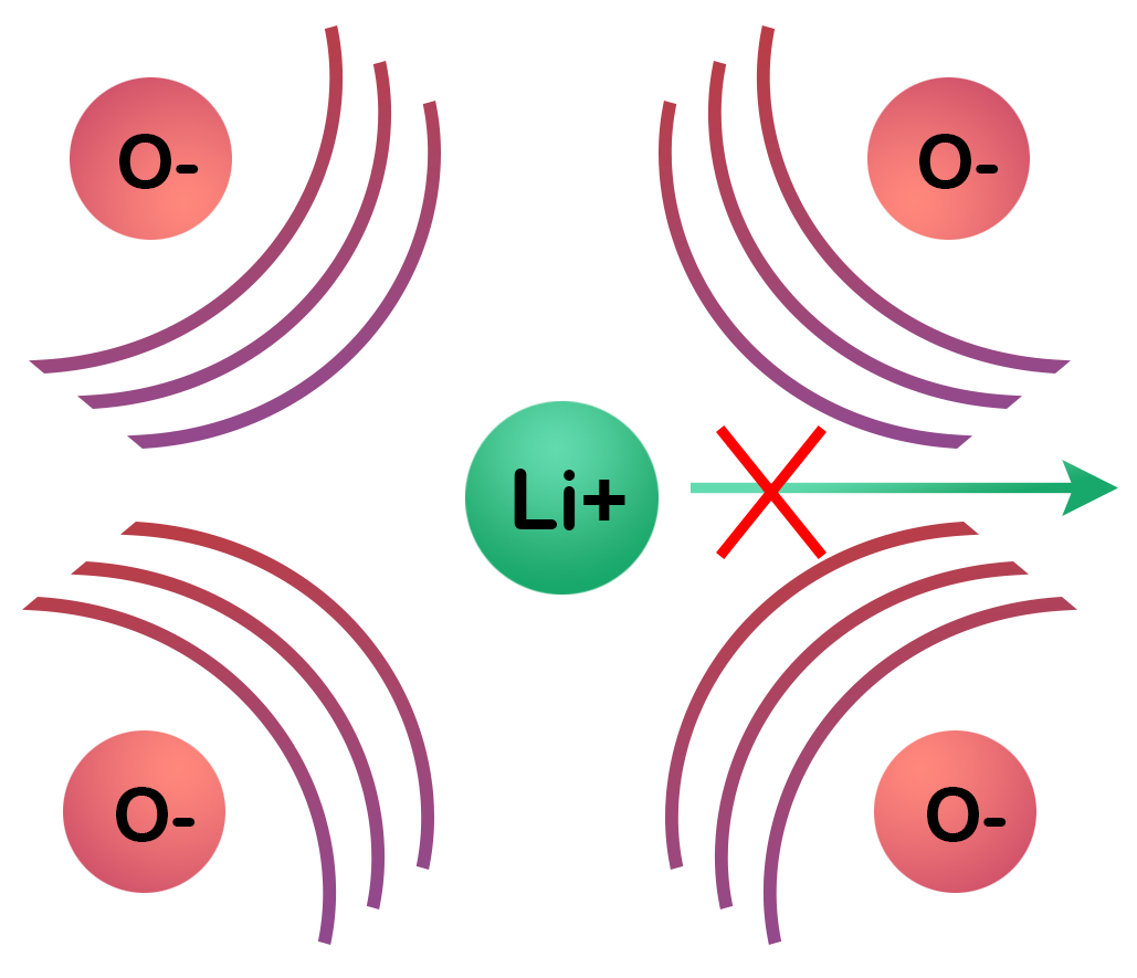 Bottlenecks: These occur when the migrating ion must pass through a constricted region in the crystal lattice, often defined by the spacing between adjacent anions (such as oxygen). If two oxygen ions are positioned too close together, their strong electrostatic repulsion creates a narrow passage. This constriction increases the migration barrier the lithium ion must overcome, effectively inhibiting its movement. The width and geometry of such bottlenecks are therefore critical descriptors of a material’s ionic conductivity, since they directly determine how easily lithium can hop from one coordination site to the next.