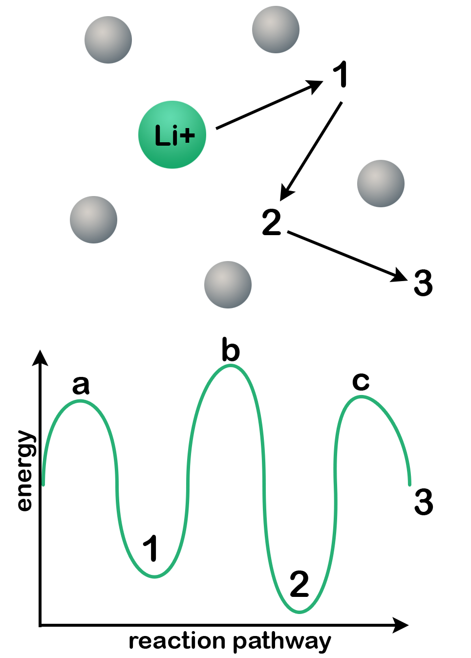 Ion pinning: Observe the following diagram. When a lithium ion migrates through a solid lattice from site 1 to site 2 to site 3, it encounters different coordination environments along its path. At site 1, the ion occupies a stable position corresponding to an energy minimum. This state is often described as a potential well. To move forward, the ion must overcome activation barriers at the adjacent saddle points (labeled a and b) before reaching the next stable site. These barriers represent the energy required for the ion to hop from one coordination site to the next, and their height determines the ease—or difficulty—of lithium transport through the material.
