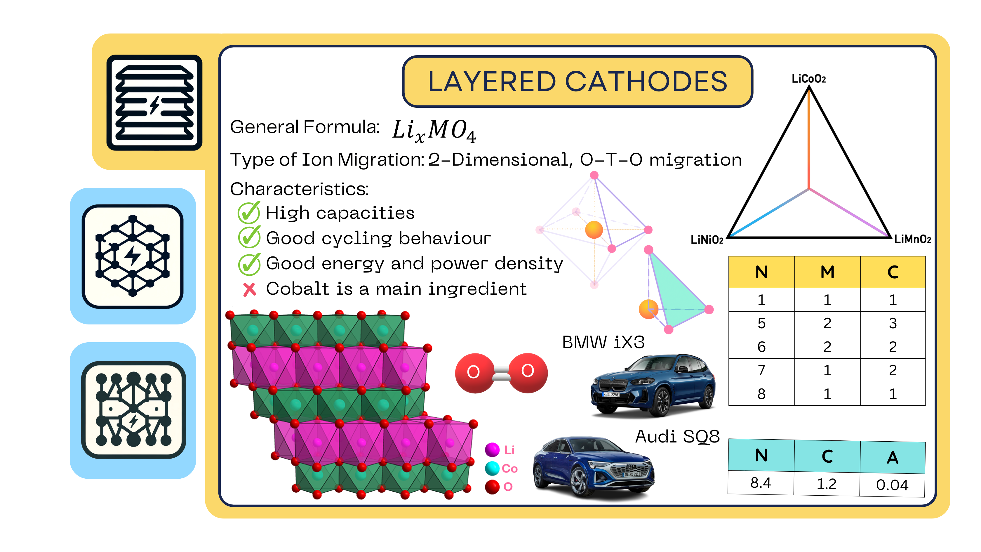 Layered oxides are the most common type of commercialized positive electrode material. These structures consist of a cubic, close-packed array of oxygen anions together with a transition metal. The organization of the transition metal determines the diffusion pathway of the lithium ions. This process is known as intercalation (or de-intercalation) of the positive charges inside the cathode.