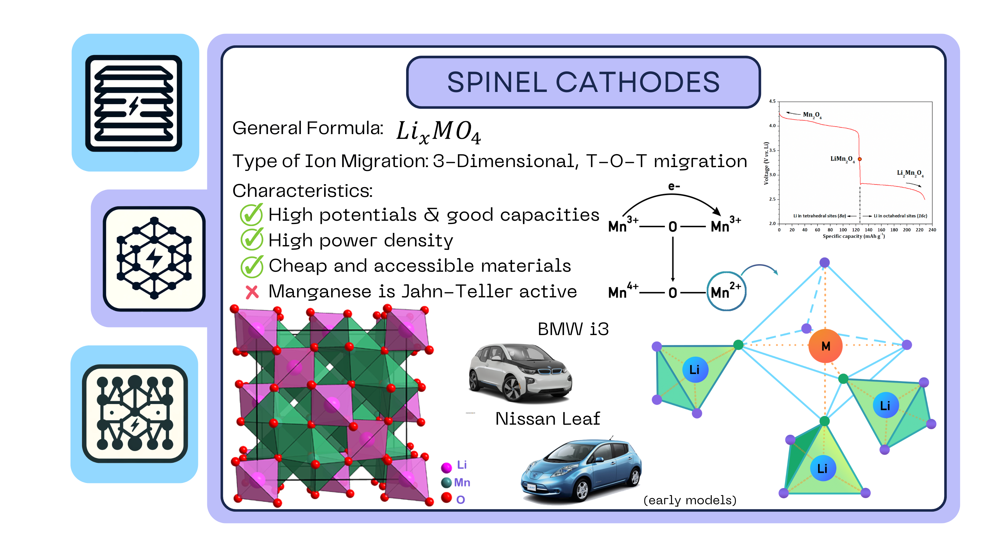 The term “spinel” refers to a specific type of crystal arrangement of atoms, named after the mineral spinel (MgAl2O4), which is the archetype for this structure. In the context of lithium-ion batteries, the most common spinel cathode material is lithium manganese oxide (LiMn2O4). Spinel cathodes consist of a cubic, closely packed array of anions that also have the octahedral and tetrahedral interstitials like the layered cathodes. However, rather than being in sheets like layered cathodes, they are organized in alternating sites within the cube, as observed:
