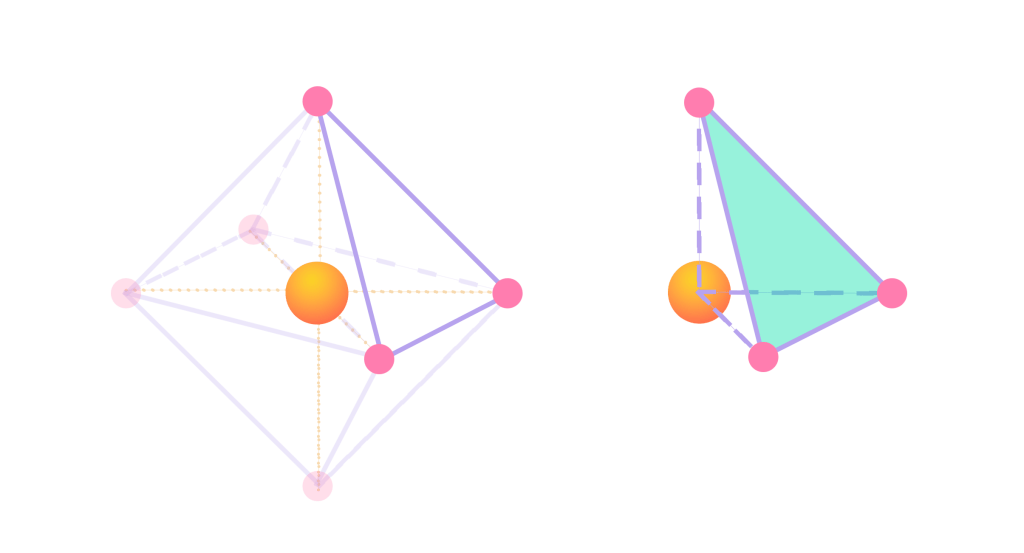 The octahedral and tetrahedral interstitials can be observed in the following figure. The octahedral geometry is obtained when the six oxygen atoms (represented by the pink spheres) align around the transition metal, which, in this case, is cobalt (represented by the orange orb), thus forming the shape with eight faces and six vertices. The atomic bonding of the cobalt with the oxygen atoms is denoted by the orange lines, while the shape of the octahedral itself is highlighted by the purple lines.