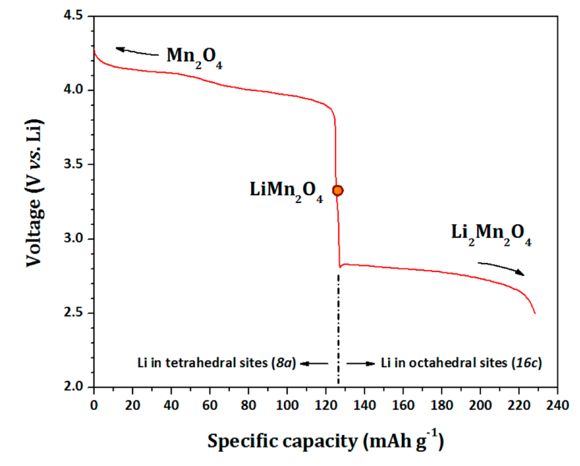 In its fully discharged, lithiated state as Li2Mn2O4, the spinel structure would, theoretically, be able to store a very large amount of lithium ions in its numerous octahedral sites, where the lithium ion sits very comfortably. However, this is not done due to the inherent issues of the manganese ion with a 3+ charge.