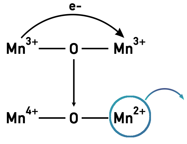 When the battery is fully charged (implying all the lithium ions are in the negative electrode), there is a mix of 50% Mn 3+ ions and Mn 4+ ions in the form of . As it begins to discharge, all the Mn 4+ ions reduce and become Mn 3+. The probability of two Mn 3+ ions connected to an oxygen then becomes very high, and this results in the donation of an electron to the adjacent Mn 3+ ions, as illustrated below. The ensuing molecule would then have an Mn 4+ ion and an Mn 2+ ion.