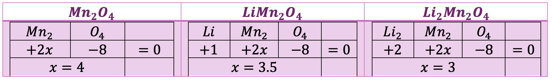 It now becomes evident that there are three species that exist while this material is being cycled (i.e., when lithium ions are being inserted during discharge and de-inserted during charge). The next aspect to consider are the charges of the manganese ion in each of these compounds. The following table illustrates these calculations: