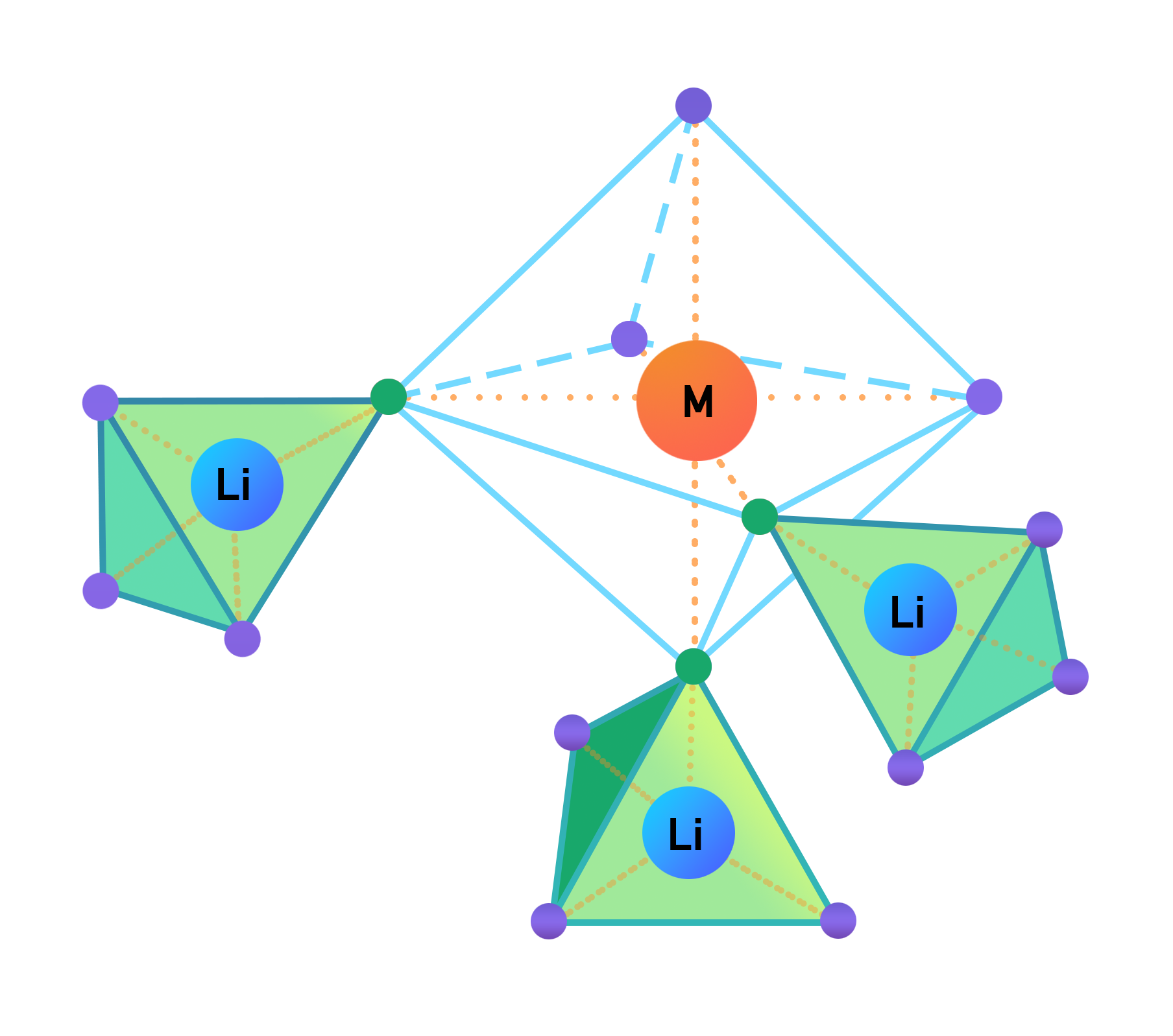 In this diagram, the transition metal is identified by the orange sphere, the lithium ion, by the blue sphere, while the oxygen anions are represented by the smaller, green, and purple orbs. The bonding between the atoms is represented by the dashed, orange lines, while the geometries that are formed are denoted by the blue lines. The octahedral geometry is symbolized by the green lines and the tetrahedral geometry, by the navy lines. Note again that these lines do not exist and are mere visual representations of the geometrical structure of the atomic bonding.