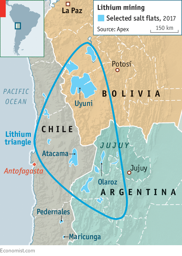 Extraction of lithium from brine consists of a series of physical and chemical reactions for a final product that contains lithium. Brines are essentially large lakes or ponds that occupy thousands of acres and that contain a variety of minerals and rocks. These brines occur naturally in different parts of the world, with a high recurrence in South America, where Argentina, Bolivia, and Chile all congregate to form what is known as the “Lithium Triangle”.