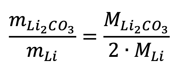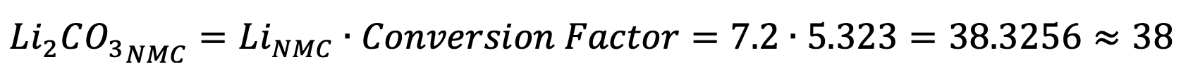 This value indicates the amount of lithium carbonate that is required from a certain amount of lithium. Because lithium carbonate only has approximately 18.8% of lithium by weight, more lithium carbonate would be needed to obtain the same amount of lithium than would be obtained from the pure metal. The numbers in the following table provide a clearer example: For every 7.2 mass units of lithium (be it in grams or kilograms) needed for the NCA cathode, the equivalent amount of lithium carbonate that is required is 38. This number was obtained with the previous formula: