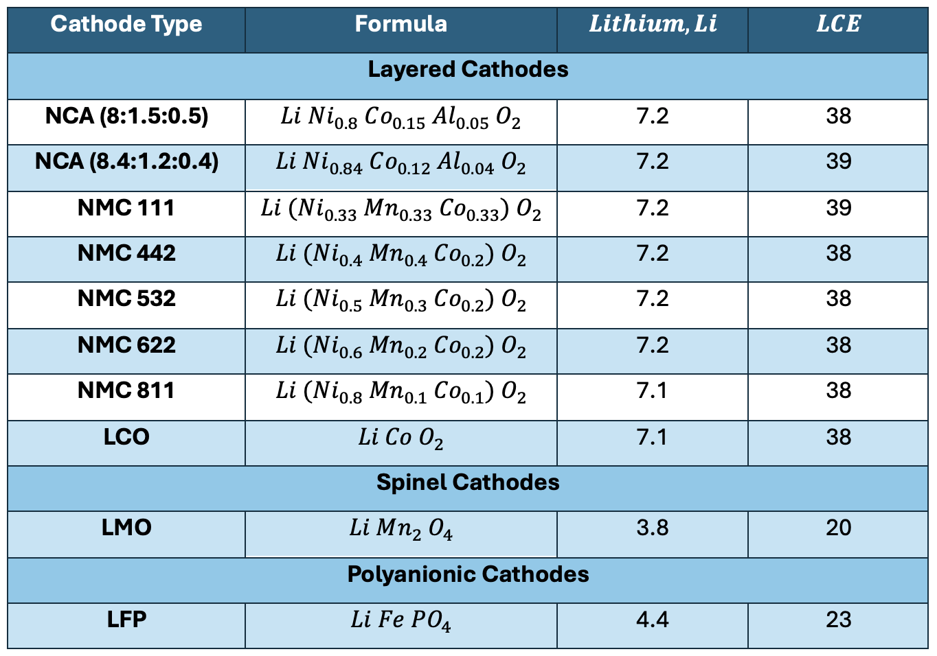 As the previous table demonstrates, all layered, nickel-manganese mixtures require almost twice the amount of lithium (and lithium carbonate) as iron-based cathodes, which are exclusively polyanionic. It is interesting to note that the spinel LMO cathode requires the least amount of lithium.