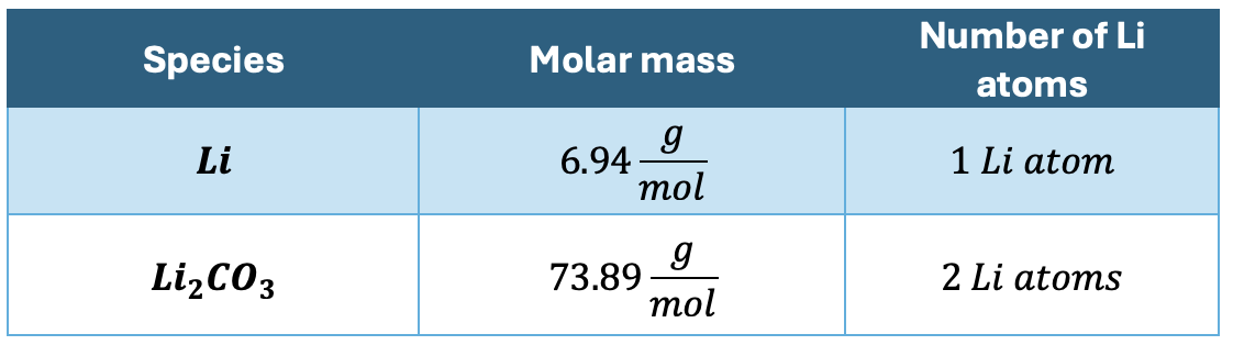 The conversion rate between lithium and lithium carbonate depends of course on their corresponding molar masses: